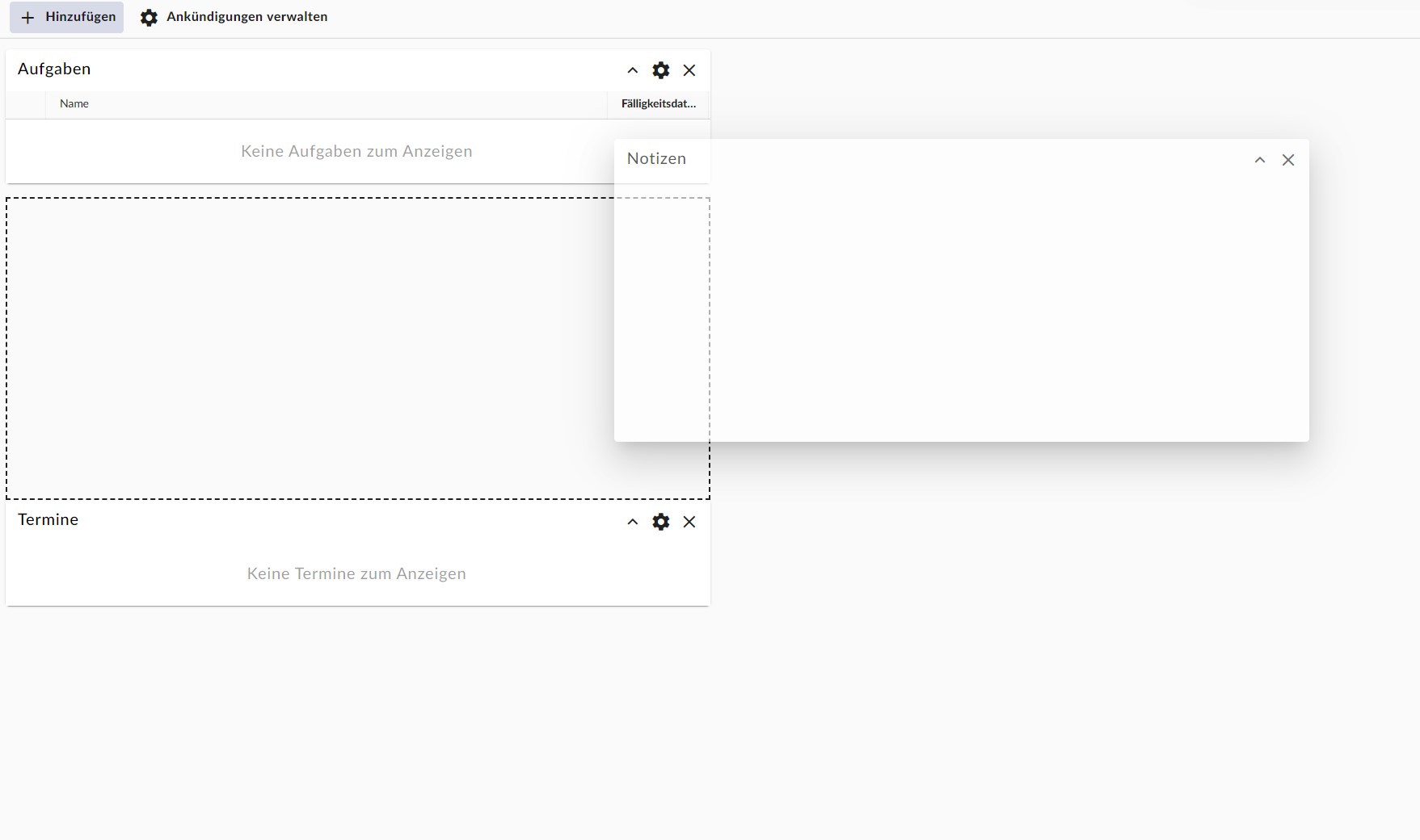 Als Standard Widget sind Aufgaben und Termine sowie ein Editor für "schnelle" Notizen eingeblendet. Die Eingaben im Editor müssen nicht gespeichert werden, da die Eingaben automatisch vom System gespeichert werden