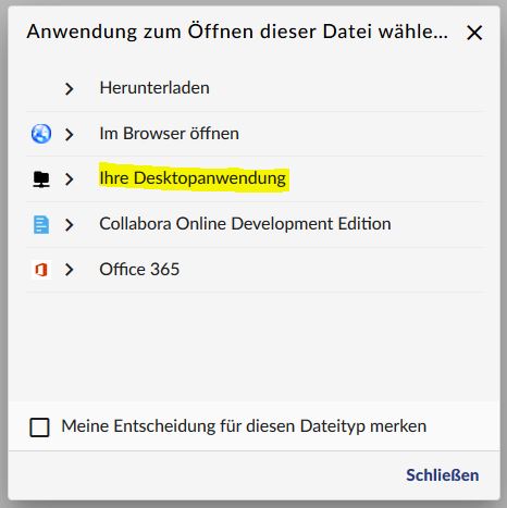 Klicken Sie mit der rechten Maustaste auf ein Dokument (z.B. doc(x), xls(x), ppt(x)) und wählen Öffnen mit aus. Im nachfolgenden Menü wählen Sie den Punkte Ihre Desktopanwendung aus.