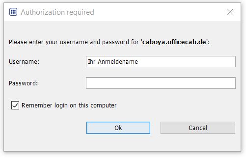 Mit einem Doppelklick auf das Dokument startet der Assistent und lädt die Datei lokal runter. Beim ersten Aufruf wird sicherheitshalber das Passwort der Groupware abgefragt. Nach erfolgreicher Eingabe wird die Datei anschließend geöffnet. Auf Wunsch das kann Passwort über das Häkchen bei Remember login on this computer dauerhaft gespeichert werden.