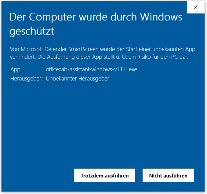 In den aktuellen Versionen von Windows sind ausführbare Dateien (*.exe) geblockt. Wenn Sie ein entsprechenden Hinweis erhalten, klicken Sie auf weitere Informationen und klicken auf den Button Trotzdem Ausführen